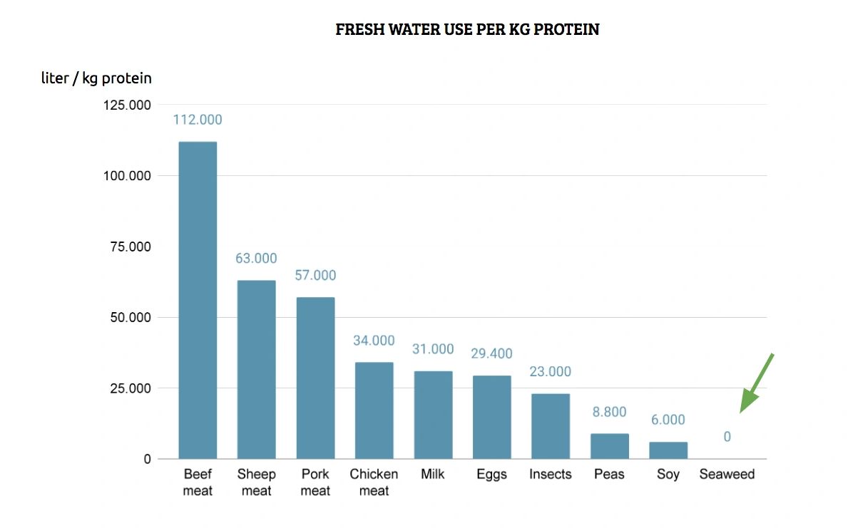 The protein yield per hectare of on-land seaweed cultivation is higher compared to cultivating land based crops, like soy beans, while seaweed does not need fresh water nor deforestation. This makes on land seaweed cultivation a promising method of cultivating protein, on an industrial scale. And all energy needed for pumping and lighting is generated by sustainable sources. This makes seaweed cultivation on land the most environmentally friendly methods for the production of protein from natural resources.